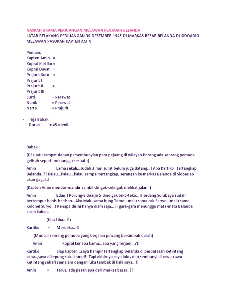 Salam berbagi untuk kalian semua. Contoh naskah drama 2 orang kentut. 2) bagian dari suatu keseluruhan proses, kejadian, atau peristiwa. Contoh naskah drama teater cinta segitiga. 1 babak ba·bak kata nomina (kata benda) 1) bagian besar dalam suatu drama atau lakon (terdiri atas beberapa adegan) contoh: Coba kamu lihat si lika, dia yang cerdas saja masih sangat rajin belajar. Oct 09, 2019 · secara teori penulisan naskah drama 1 babak tidak ada bedanya dengan naskah drama 2 atau 3 babak. Contoh naskah drama untuk 10 orang pemain membuat naskah dialog drama untuk 10 orang pemain memang dibutuhkan kejelihan serta memerlukan sumber inspirasi yang baik, karena naskah drama untuk 10 orang pemain ini lazimnya akan berisikan banyak teks dialog sehingga proses pengerjaannya biasanya relatif memakan waktu. Contoh naskah drama dua babak berupa skenario. Jika, anda tertarik dan ingin mengetahui lebih lanjut silahkan. Narator pun memberi instruksi pada pemeran nira, jim serta bu shinta agar masuk kedalam settingan yang sama. More images for contoh drama 2 babak » Mereka adalah ima, lika, yuni, dan tini.